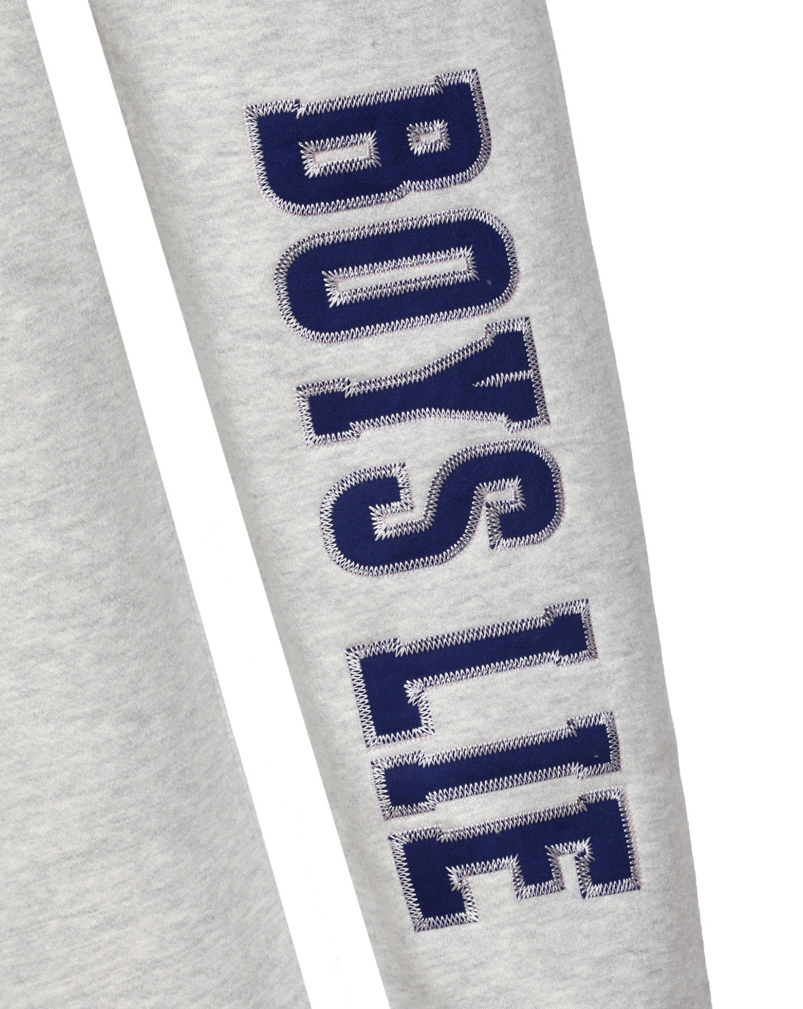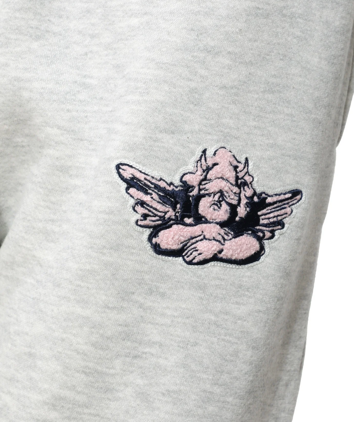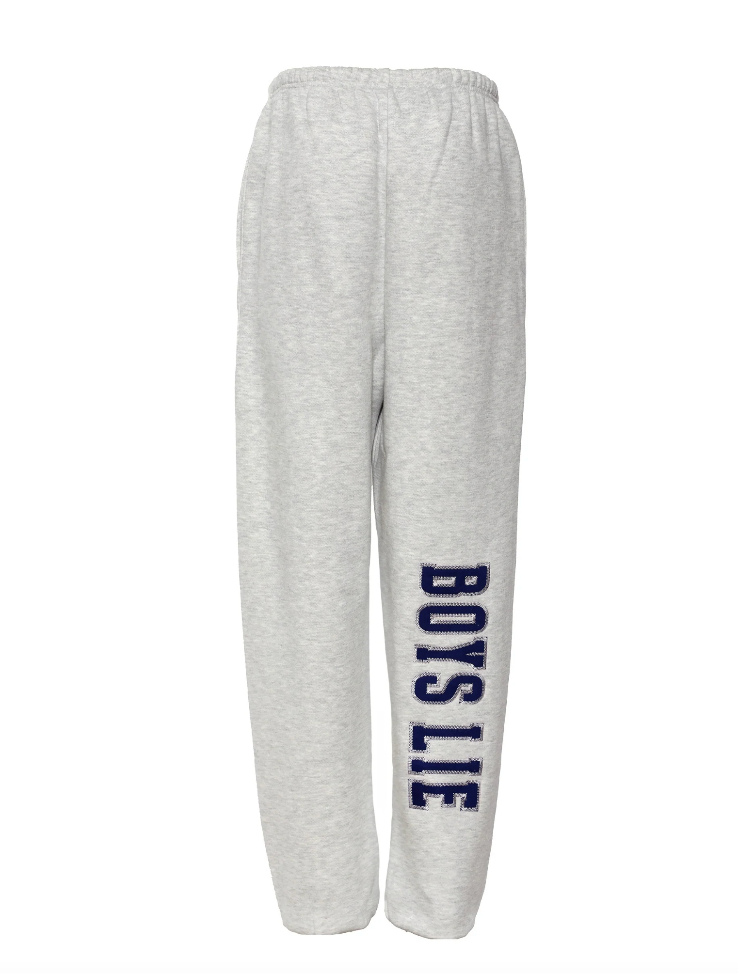 The heather grey Smoke and Mirrors pants feature navy Boys Lie embroidery along one back leg and a small pink and navy cherub patch on the front. Sleek, soft, and effortlessly cool, they're a subtle standout perfect for everyday wear.